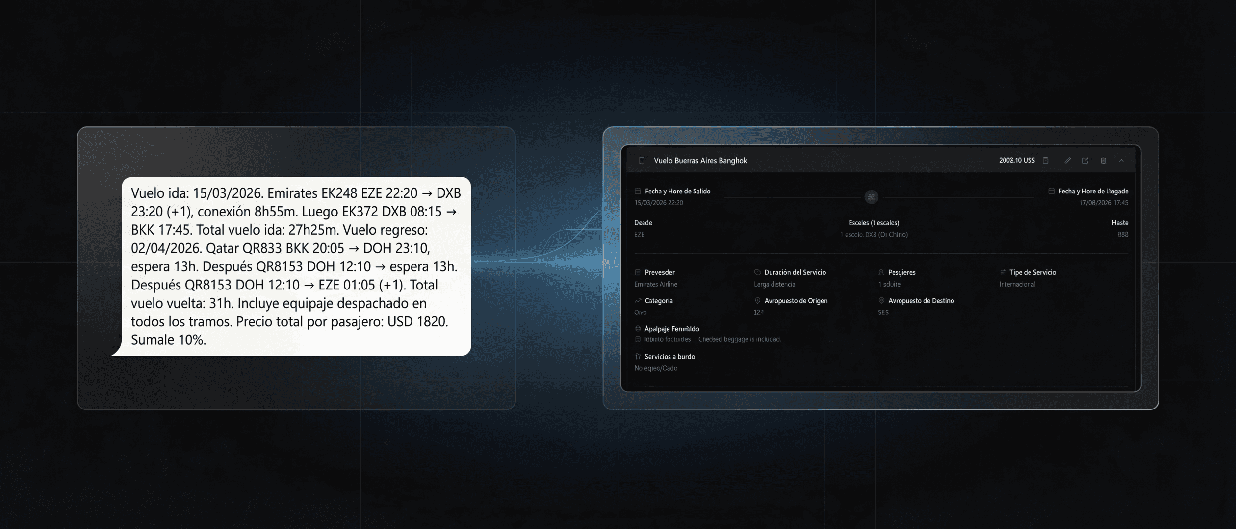 El agente de cotización con IA ahora interpreta correctamente los vuelos con múltiples paradas y los agrupa en un único servicio, mostrando segmentos y duraciones de escala en orden. Ya no separa el mismo itinerario en múltiples “opciones” que confundían tanto a los asesores como a los pasajeros.